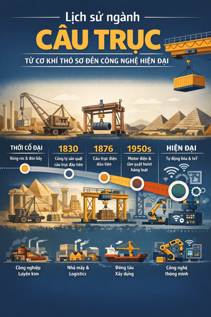 Lịch sử ngành cầu trục là một hành trình dài từ những khái niệm ròng rọc thô sơ của các nền văn minh cổ đại đến những hệ thống nâng hạ hiện đại với công nghệ cao ngày nay. Trong gần 200 năm phát triển công nghiệp, cầu trục đã trở thành trái tim của hệ thống xử lý vật liệu, đóng góp to lớn cho tiến trình công nghiệp hóa và tự động hóa toàn cầu